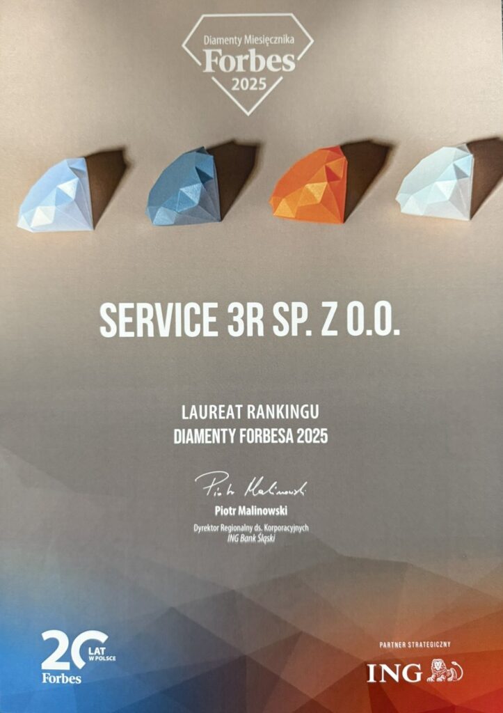 Мы рады сообщить, что получили отличную новость от редакции польского издания журнала «Forbes»: компания Service 3R Sp. z o.o. в Зегже стала одним из лауреатов престижного рейтинга Forbes Diamonds 2026 года.